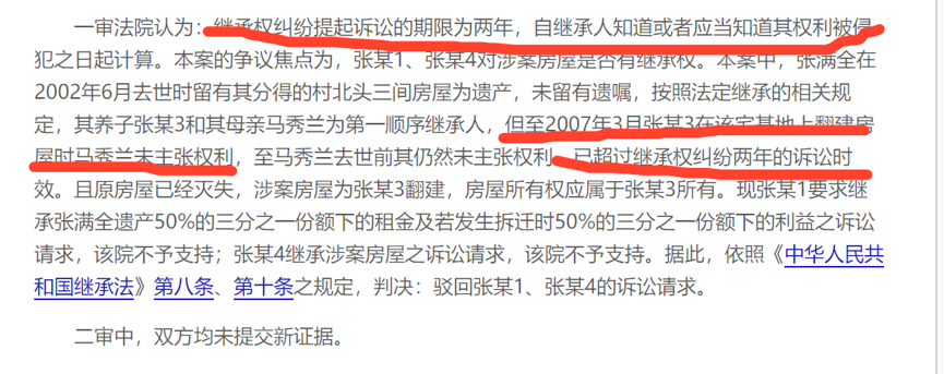 但是,根據《繼承法》(1985年10月1日實施)第八條規定,繼承權糾紛提起訴訟的期限為二年,自繼承人知道或者應當知道其權利被侵犯之日起計算。但是,自繼承開始之日起超過二十年的,不得再提起訴訟。另外,《最高人民法院關于貫徹執行〈中華人民共和國繼承法〉若干問題的意見》(1985年9月11日實施)第十八條規定:自繼承開始之日起的第十八年后至第二十年期間內,繼承人才知道自己的權利被侵犯的,其提起訴訟的權利,應當在繼承開始之日起的二十年之內行使,超過二十年的,不得再行提起訴訟。因此,如果你的繼承權被侵犯了也是適用訴訟時效制度的。為證明這一事實,小編查找了一則案例: