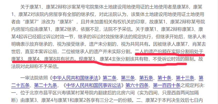 2016年11月30日《第八次全國法院民事商事審判工作會議(民事部分)紀要》出臺,其中第二十五條明確規定,被繼承人死亡后遺產未分割,各繼承人均未表示放棄繼承,依據繼承法第二十五條規定應視為均已接受繼承,遺產屬各繼承人共同共有;當事人訴請享有繼承權、主張分割遺產的糾紛案件,應參照共有財產分割的原則,不適用有關訴訟時效的規定。這一規定的出臺對于繼承案件的裁判具有重要的指導意義,同時也使繼承案件中訴訟時效的運用逐漸邊緣化。這不北京市第一中級人民法院作出了類似的判決--(2019)京01民終9074號判決如下: